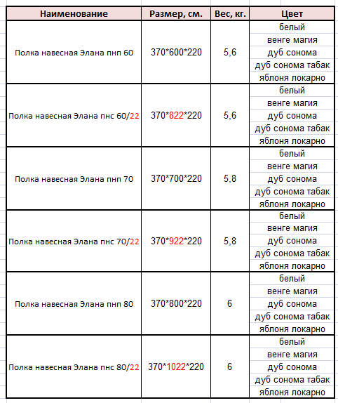 Полка навесная Анрат Элана 2.48; 2.72; 2.96