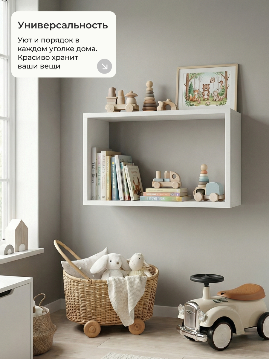 Полка размещается на плоскости стены. Лёгкая открытая полка, тренд дизайнерского наполнения пространства жилых и нежилых помещений. Минималистический дизайн, стильная, легкая, легко крепится. Визуально разгружает пространство комнаты, избавляет от давления закрытых полок. Доступность предметов.