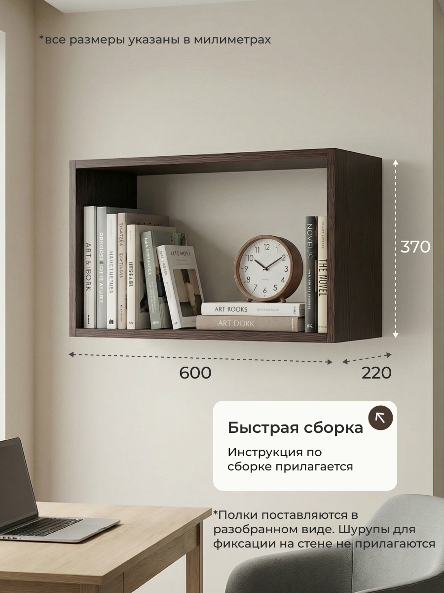 Полки поставляются в разобранном виде. Инструкция по сборке прилагается. Шурупы для фиксации на стене не прилагаются, так как материалы стен различаются. Для выбора подходящих крепежных средств обратитесь в местный специализированный магазин.