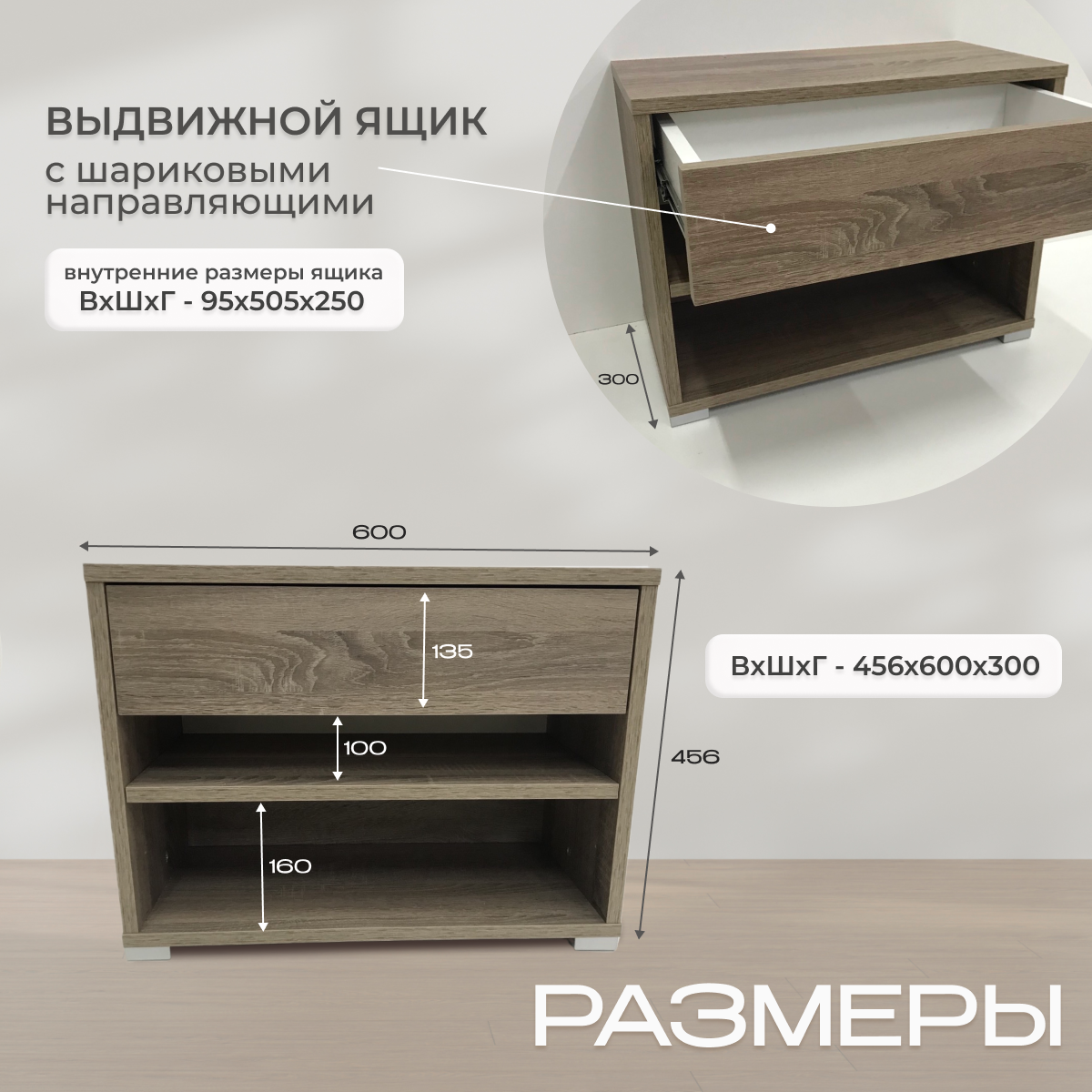 Изделие изготовлено с открытой полкой, имеется выдвижной ящик для хранения мелких вещей и аксессуаров. Для хранения предметов предусмотрено две ниши. Нижняя ниша высотой 16 см, вторая подойдет для домашней, летней обуви высотой 10 см. При необходимости полку можно убрать и получить единую нишу высотой 26 см.