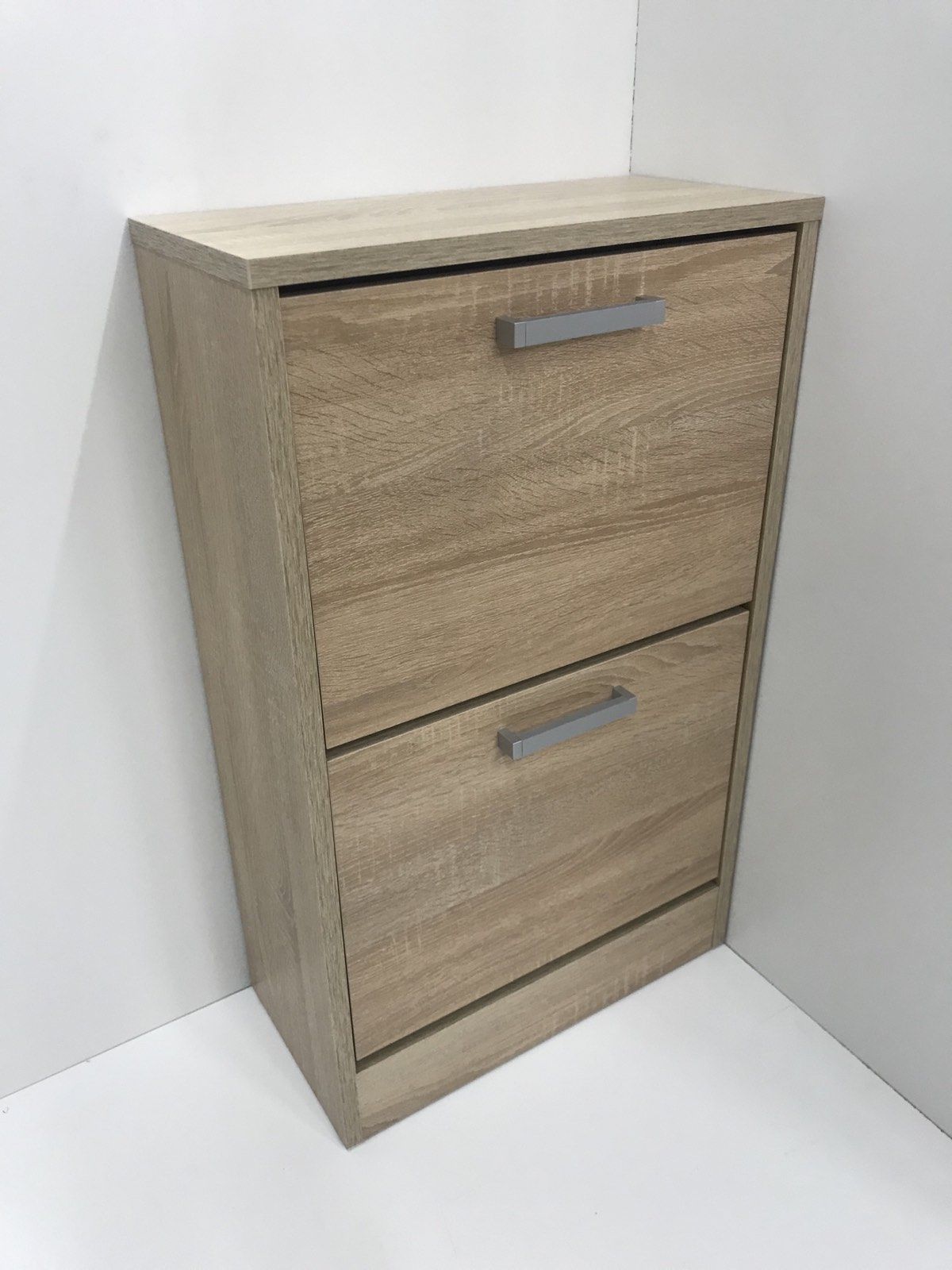 сборно-разборная конструкция, классическая форма, вместительная тумба имеет от одного до четырех откидных отделений для хранения обуви, за дверью фасада обувницы расположено поворотное устройство под обувь, образующее при открывании две ниши для хранения обуви, в механизме предусмотрена регулировка ниш по высоте, что позволяет хранить обувь разного размера, тумба собирается на 3-х компонентных эксцентриковых стяжках. Имеется 4 пластиковые опоры, с целью предотвращения опрокидывания при открывании предусмотрено крепление тумбы к стене через задние царги с помощью дюбель гвоздя.