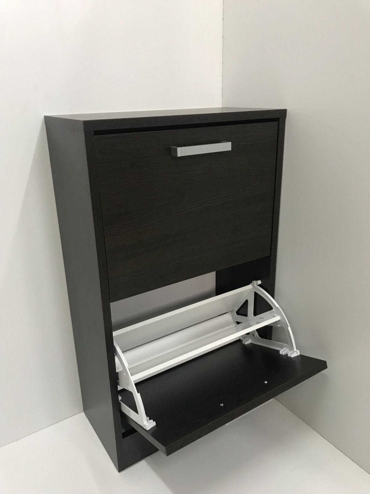 сборно-разборная конструкция, классическая форма, вместительная тумба имеет от одного до четырех откидных отделений для хранения обуви, за дверью фасада обувницы расположено поворотное устройство под обувь, образующее при открывании две ниши для хранения обуви, в механизме предусмотрена регулировка ниш по высоте, что позволяет хранить обувь разного размера, тумба собирается на 3-х компонентных эксцентриковых стяжках. Имеется 4 пластиковые опоры, с целью предотвращения опрокидывания при открывании предусмотрено крепление тумбы к стене через задние царги с помощью дюбель гвоздя.