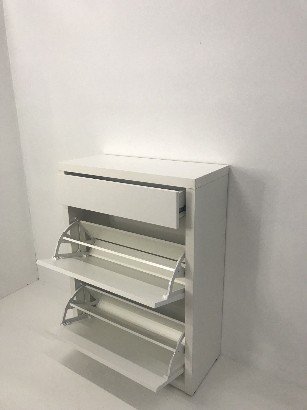 Особенность конструкции — поворотное устройство за дверью фасада: при открывании оно образует две регулируемые по высоте ниши, что позволяет удобно разместить обувь разных размеров.