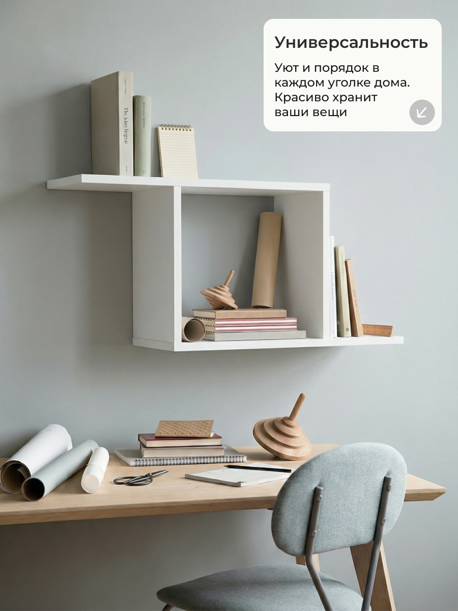 Полка размещается на плоскости стены. Лёгкая открытая полка, тренд дизайнерского наполнения пространства жилых и нежилых помещений. Минималистический дизайн, стильная, легкая, легко крепится. Визуально разгружает пространство комнаты, избавляет от давления закрытых полок. Доступность предметов.