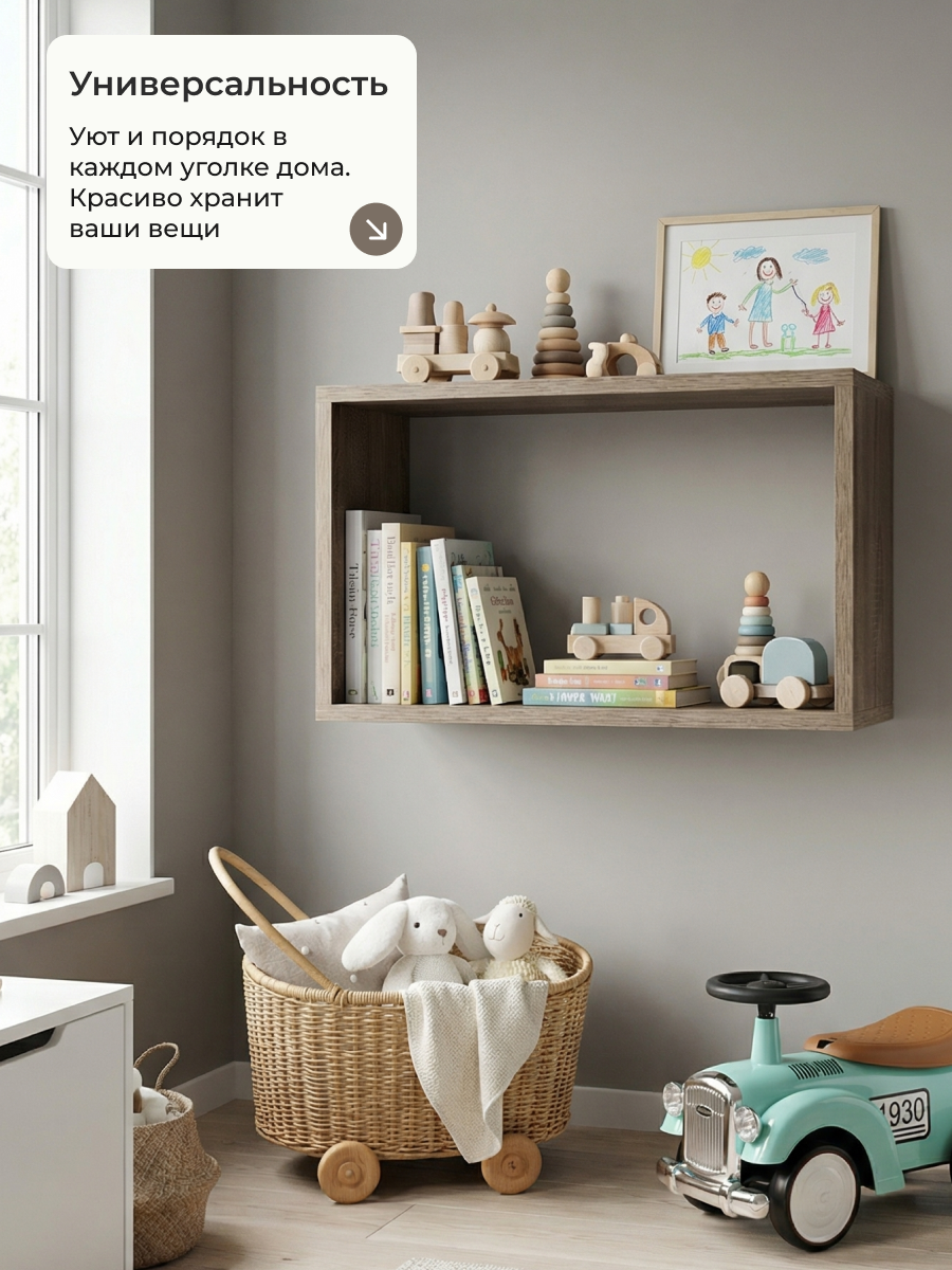 Полка размещается на плоскости стены. Лёгкая открытая полка, тренд дизайнерского наполнения пространства жилых и нежилых помещений. Минималистический дизайн, стильная, легкая, легко крепится. Визуально разгружает пространство комнаты, избавляет от давления закрытых полок. Доступность предметов.