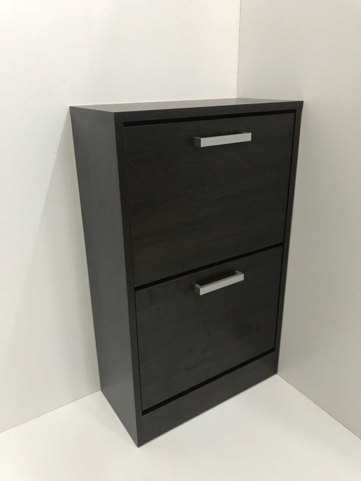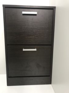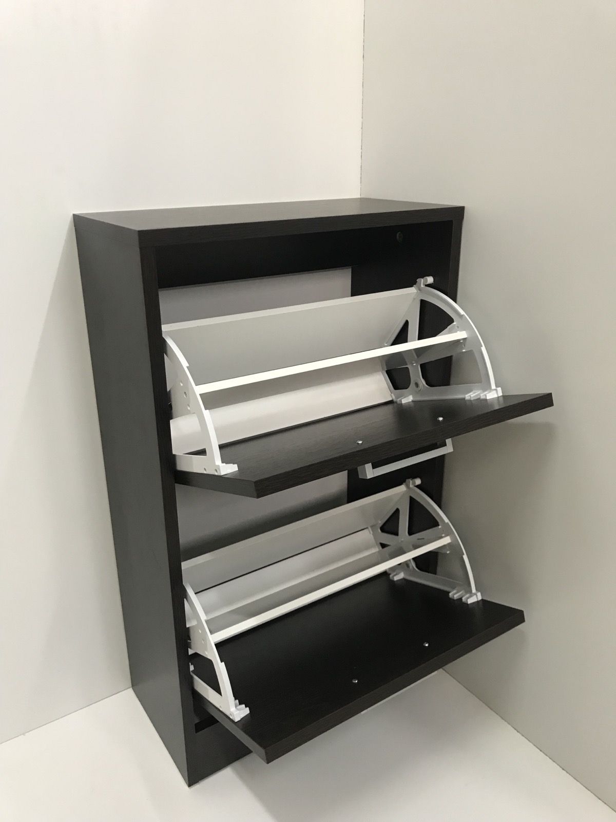 сборно-разборная конструкция, классическая форма, вместительная тумба имеет от одного до четырех откидных отделений для хранения обуви, за дверью фасада обувницы расположено поворотное устройство под обувь, образующее при открывании две ниши для хранения обуви, в механизме предусмотрена регулировка ниш по высоте, что позволяет хранить обувь разного размера, тумба собирается на 3-х компонентных эксцентриковых стяжках. Имеется 4 пластиковые опоры, с целью предотвращения опрокидывания при открывании предусмотрено крепление тумбы к стене через задние царги с помощью дюбель гвоздя.