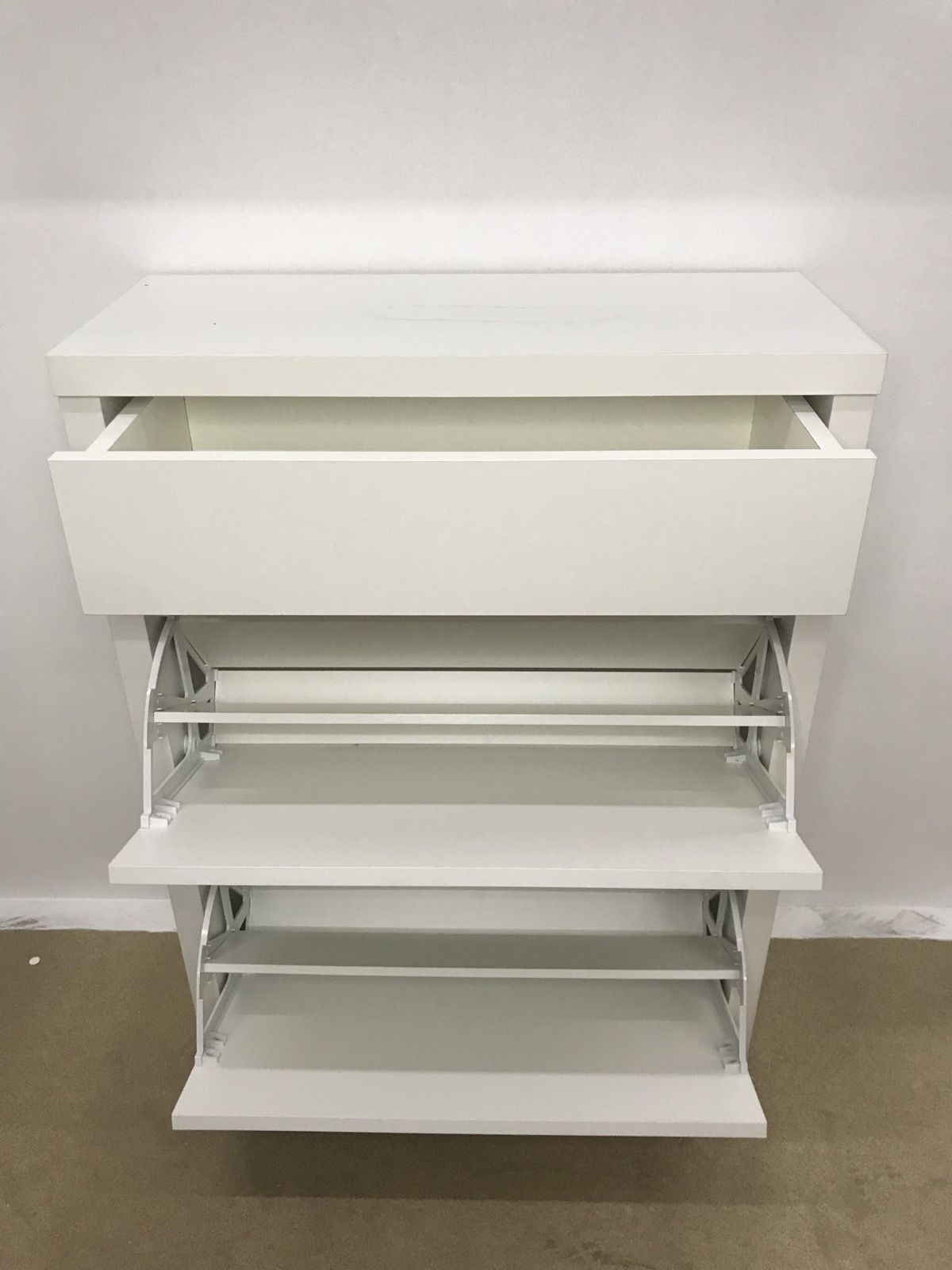 Особенность конструкции — поворотное устройство за дверью фасада: при открывании оно образует две регулируемые по высоте ниши, что позволяет удобно разместить обувь разных размеров.