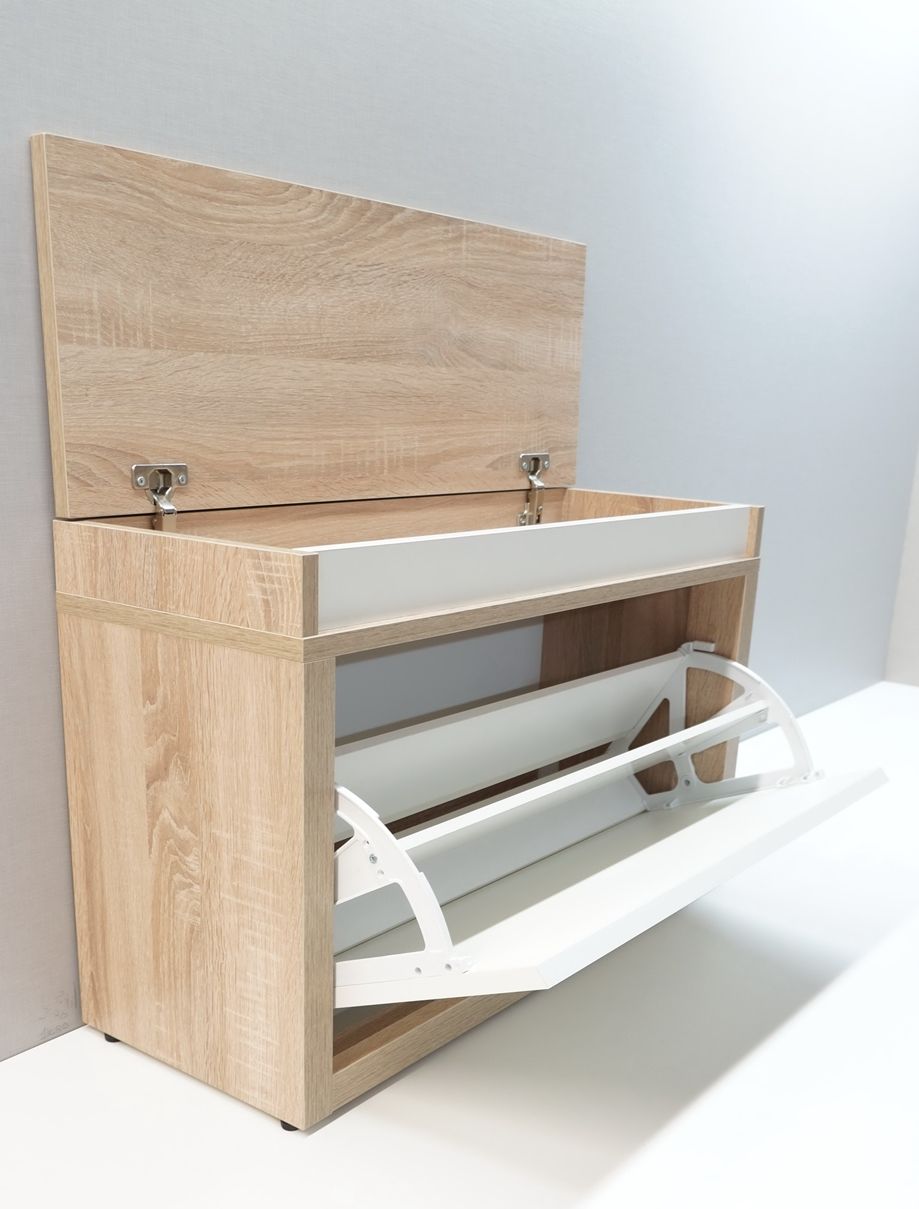Тумба для обуви Анрат «Элана 1к.80» — Тумба для обуви с одной откидной секцией и нишей сверху — это компактная и функциональная мебель для прихожей, которая сочетает хранение обуви и организацию пространства для мелких предметов. Такая модель обычно включает несколько конструктивных элементов: Откидная секция для обуви — основное отделение, доступ к которому открывается путём откидывания фасада. Это позволяет удобно размещать и доставать обувь. Ниша сверху —закрытое отделение, расположенное над откидной секцией. Здесь можно хранить повседневные предметы, аксессуары, головные уборы, перчатки или другие мелочи.